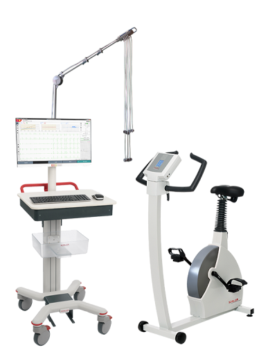 Kompletter Ergometrie-Messplatz mit Cardiovit FT-1 PC-EKG, CS-104 Software, Gerätewagen, Elektroden-Saugeinheit und Ergometer. Alles-in-einem-Lösung für die ergometrische Belastungsuntersuchung.